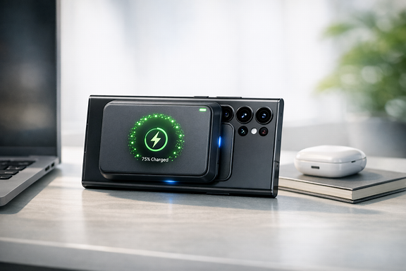 삼성전자가 새로운 무선 보조배터리 제품인 Magnet Wireless Battery Pack을 글로벌 시장에서 판매하기 시작했습니다. 이 제품은 최신 플래그십 스마트폰인 갤럭시 S26 시리즈를 위해 설계된 Qi2 규격 기반 자석식 무선 파워뱅크입니다.