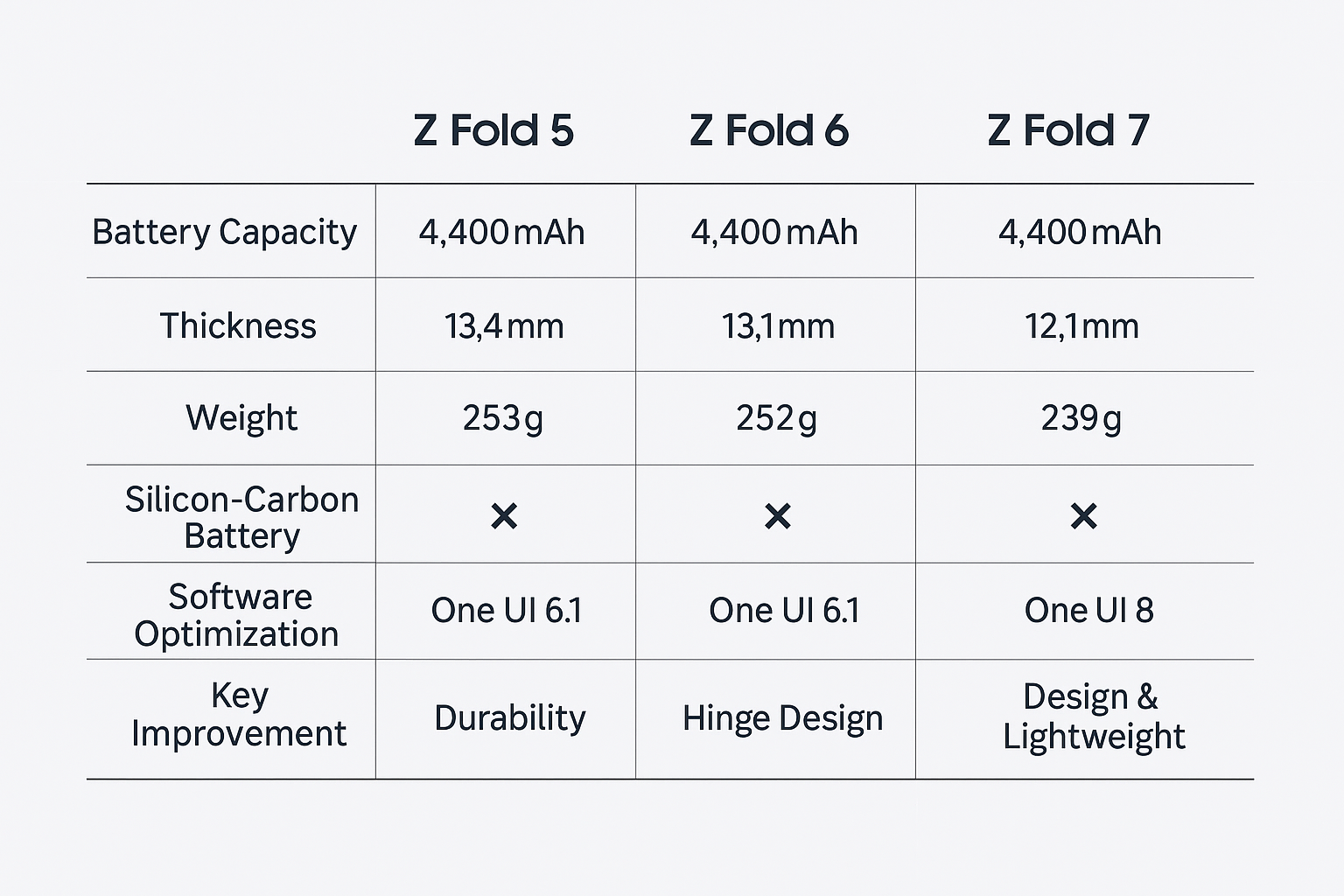 Galaxy Z Fold 시리즈 배터리 변화 및 전략 비교 (영문 구성)