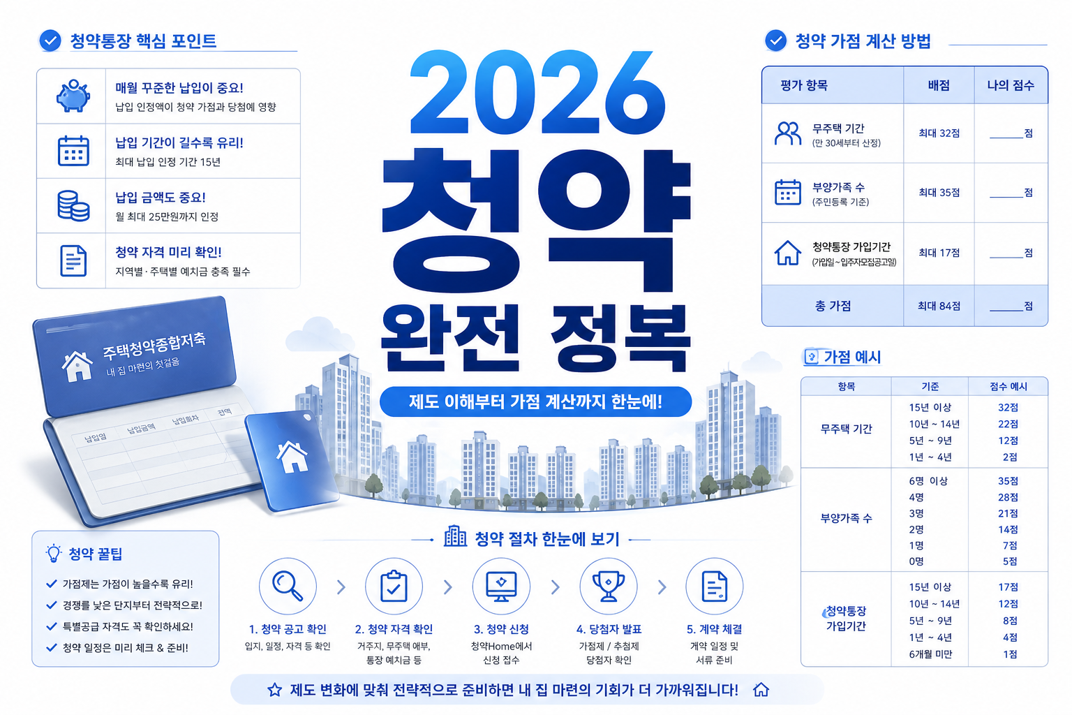 2026년 청약 제도 완전 정리입니다. 구형 청약통장 전환 기한(9월 30일), 1순위 조건, 가점 계산법, 신혼부부·생애최초·다자녀 특별공급 자격까지 한 번에 확인하세요.