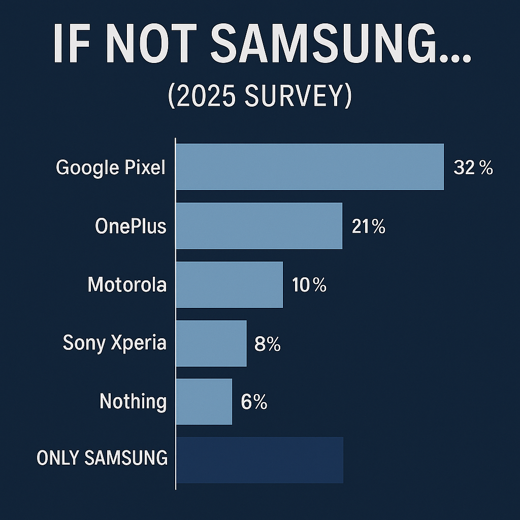 삼성 갤럭시는 여전히 안드로이드 진영의 절대 강자입니다. 하지만 이번 설문조사는 갤럭시 팬들조차 구글 픽셀과 원플러스를 잠재적 대안으로 고려하고 있음을 보여주었습니다. 이는 소비자들이 한 브랜드에 ‘올인’하지 않고, 언제든 더 나은 경험을 위해 이동할 준비가 되어 있음을 의미합니다.