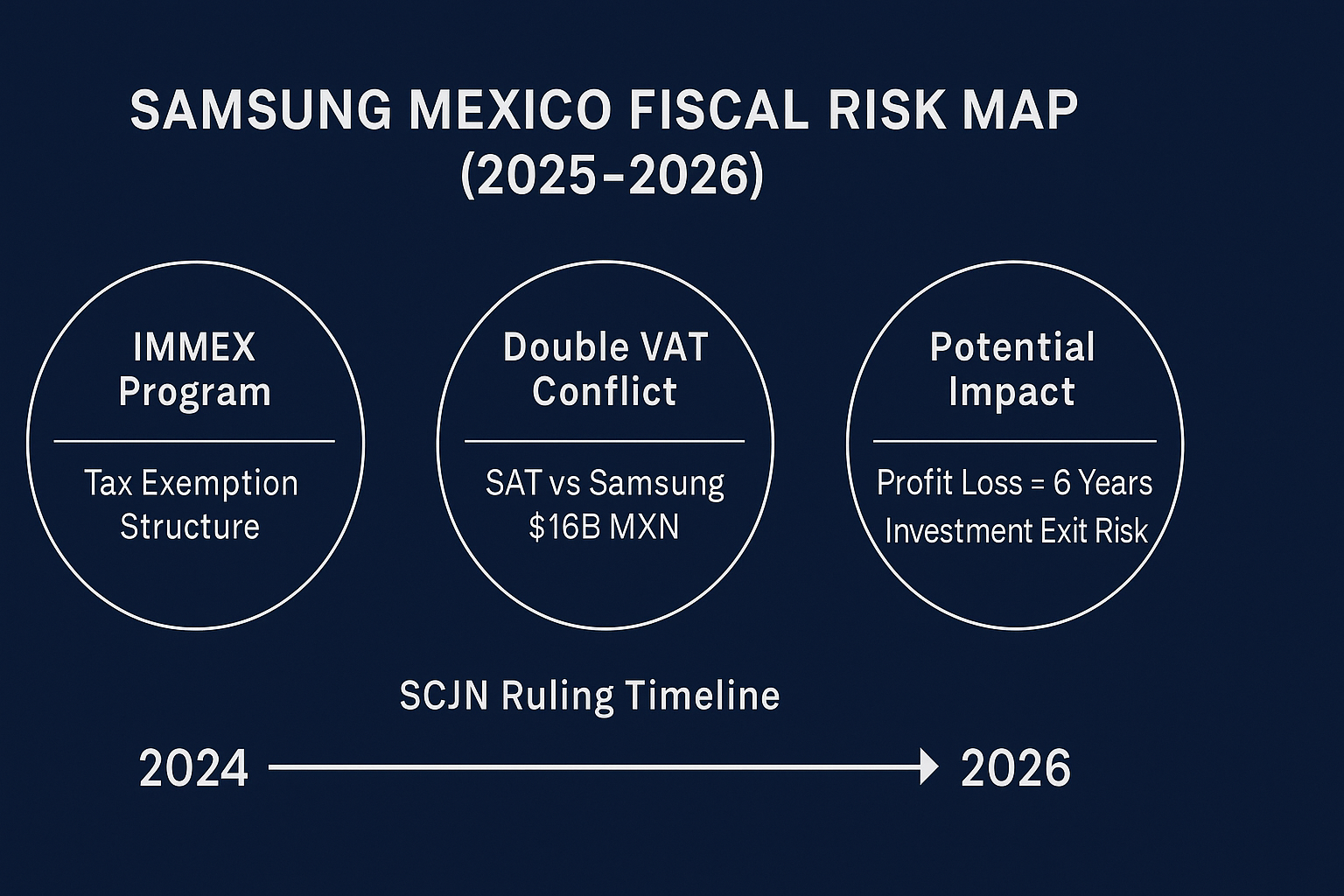 SAT는 삼성전자 멕시코 법인(Samsung Electronics México)을 포함한 24개 기업이 부가가치세(IVA)를 이중으로 공제받았다고 주장합니다. 세무청의 계산에 따르면, 이 논쟁에서 다투어지는 금액은 총 1만 6,000억 페소(약 1조 4,000억 원).