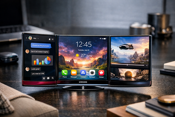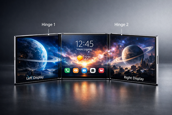 대표적인 예가 트리플 폴딩 스마트폰 콘셉트입니다. 이 제품은 화면이 세 번 접히는 구조로 더 큰 화면을 제공하는 형태였습니다.