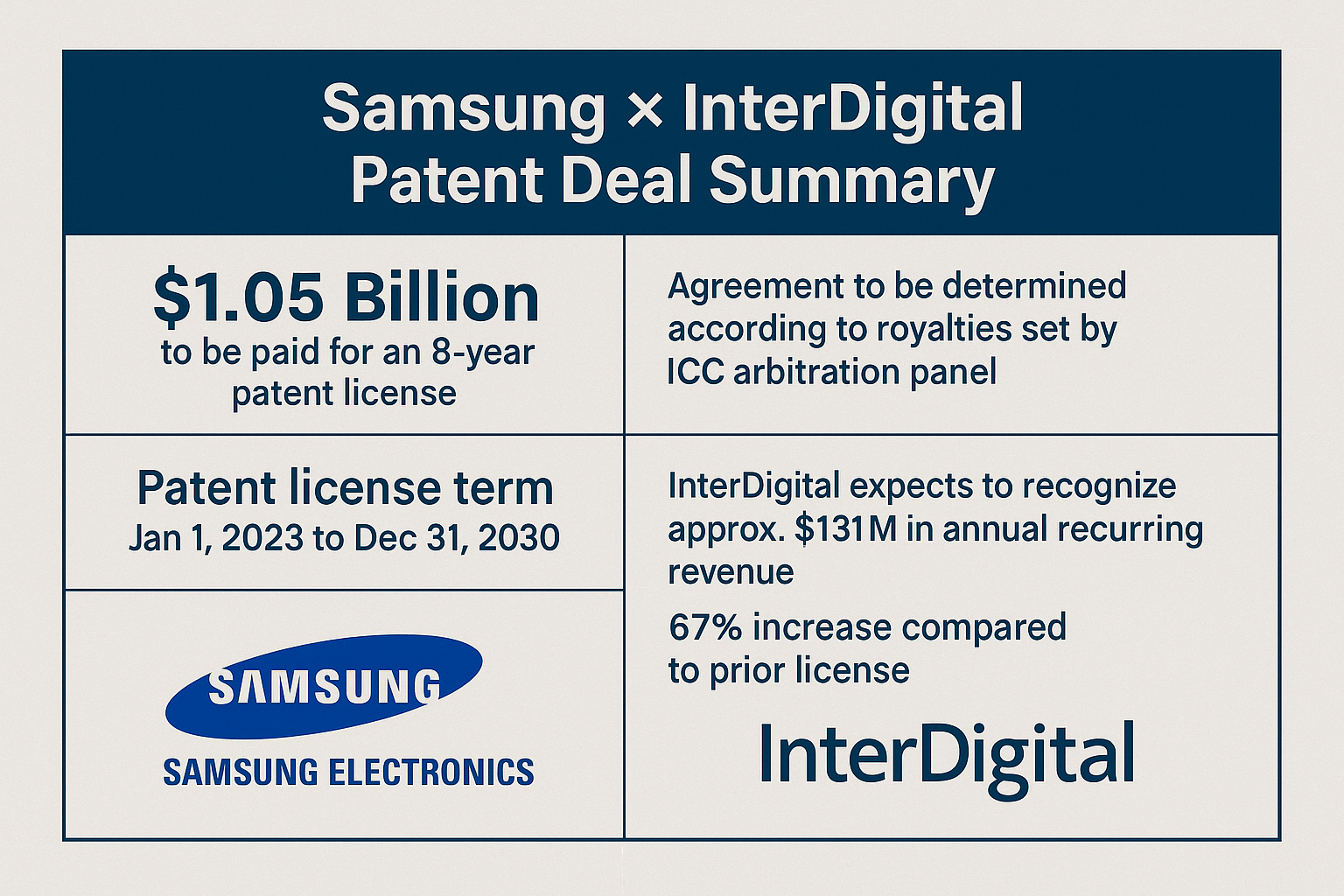 2025년 7월, 특허 시장에서 의미 있는 한 장면이 펼쳐졌습니다. 삼성전자가 미국의 통신 기술 전문 기업 InterDigital과 체결한 새로운 특허 라이센스 계약이 그것입니다. 이번 계약은 8년간 무려 10억 5천만 달러에 달하는 규모로, 글로벌 특허 라이선스 시장에서 삼성전자의 입지를 다시금 부각하는 계기가 되었습니다.