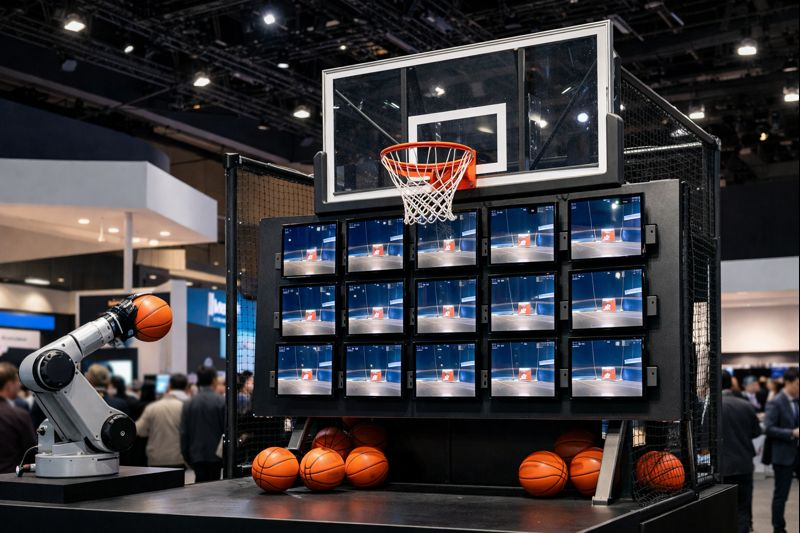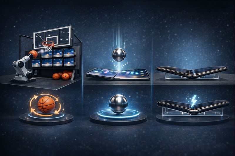이번 기술 전시 현장에서 삼성은 로봇 팔을 활용한 실험 공간을 구성했습니다. 농구 골대 형태의 구조물에 총 열여덟 장의 폴더블 올레드 패널을 고정한 뒤, 로봇이 반복적으로 농구공을 던져 화면에 직접 충격을 가합니다. 단발성 이벤트가 아니라 지속적인 반복 충격을 전제로 한 실험이라는 점에서 의미가 큽니다.