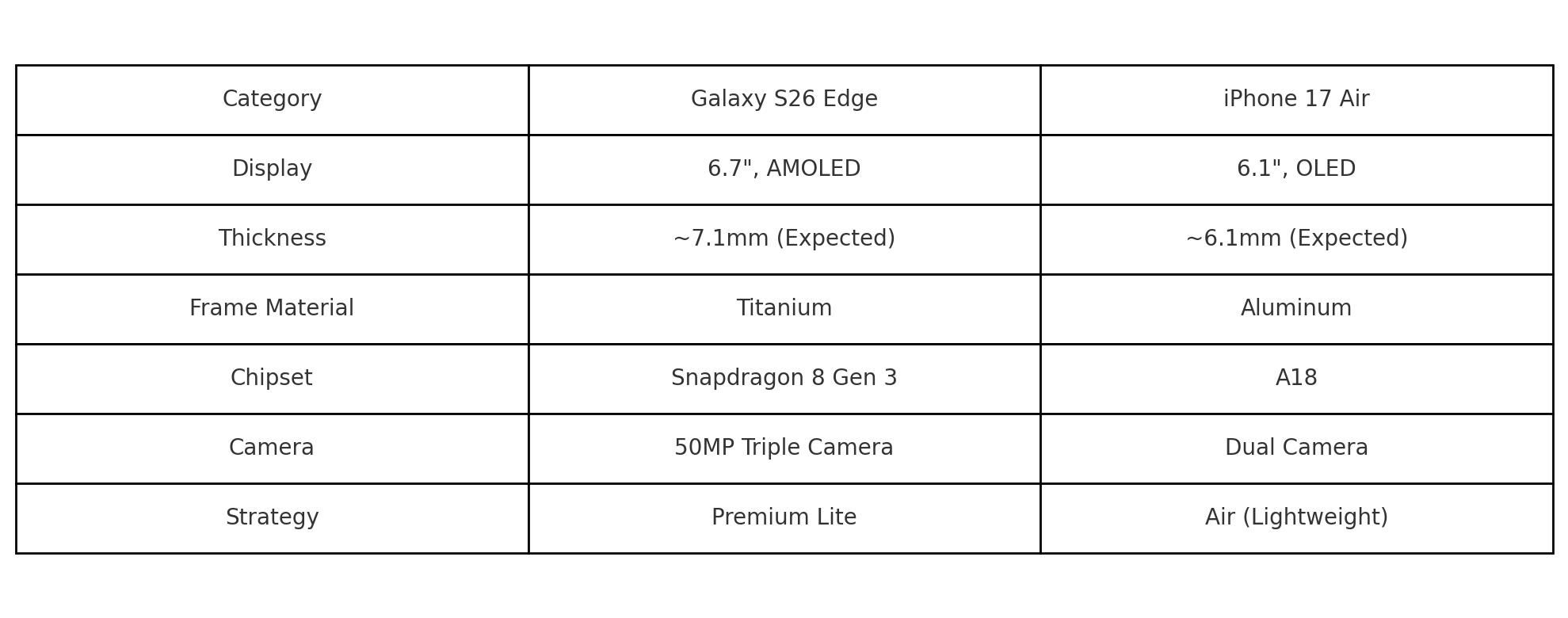 Galaxy S26 Edge vs iPhone 17 Air 사양 비교 (영문)