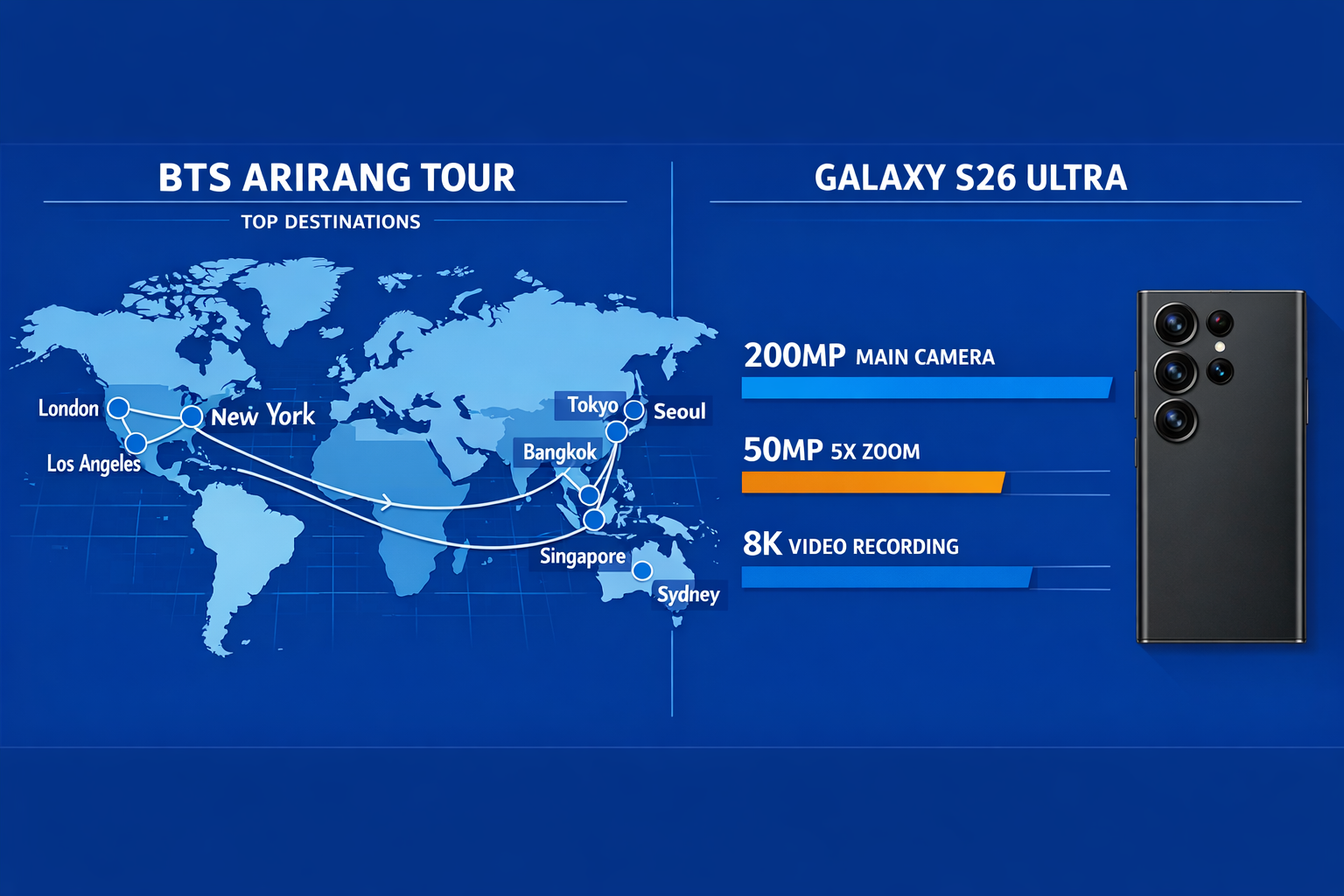 삼성 Galaxy S26 Ultra가 BTS ARIRANG 투어 공식 기기로 선정. 200MP 메인카메라와 8K 비디오 녹화로 라이브 콘서트 촬영 최적화. 서울 강남 체험 공간 운영, 글로벌 투어 일정 분석.