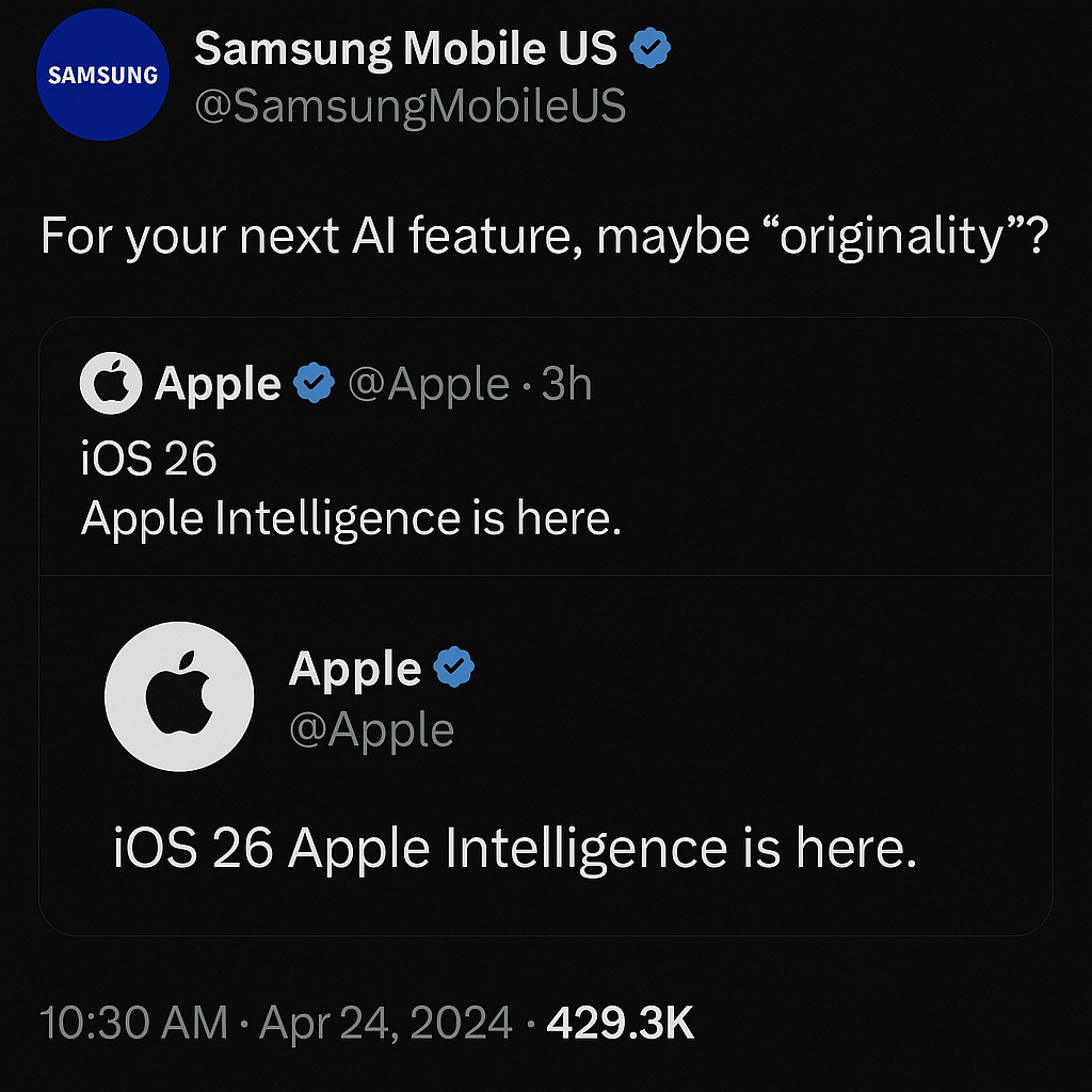2025년 WWDC에서 애플은 iOS 26을 공식 발표하며 새로운 AI 기능을 대대적으로 소개했습니다. 하지만 그 발표가 끝나자마자, 미국 삼성전자 계정은 소셜 미디어를 통해 날카로운 비판과 조롱의 메시지를 던졌습니다. “새롭다면서요?”라는 문구 아래, 이미 갤럭시에서 수년간 사용해 온 기능들이 나열된 트윗은 누가 봐도 애플을 겨냥한 풍자였습니다.