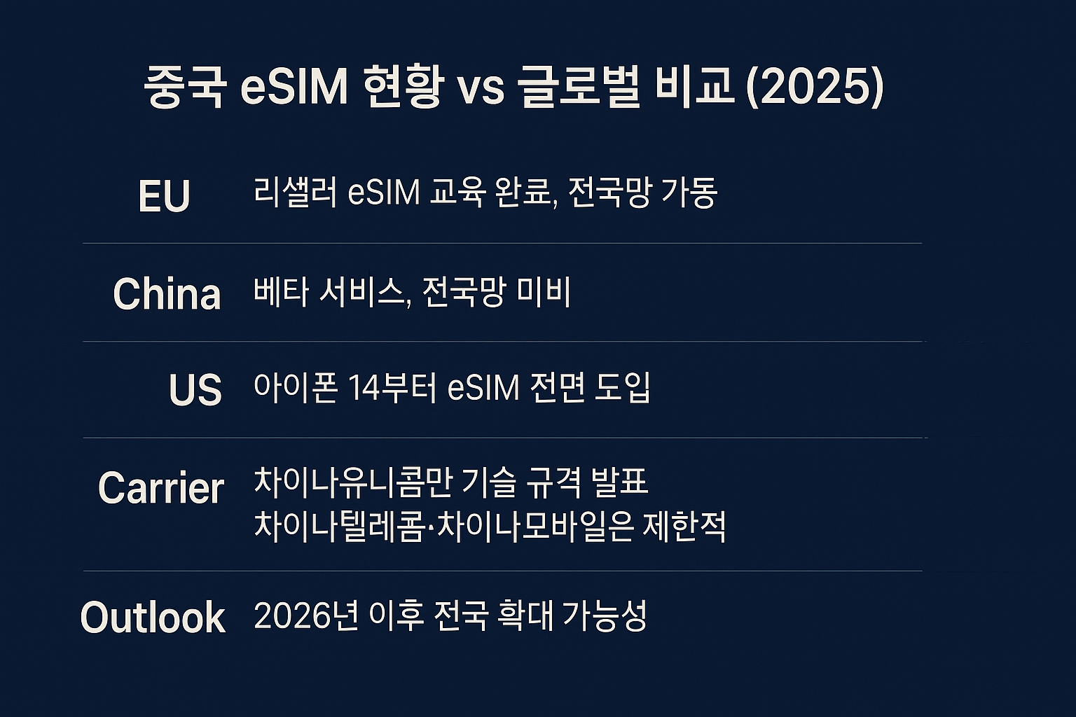 반면 한국·미국·유럽 기업들은 이미 eSIM을 포함한 차세대 통신 표준으로 이동 중입니다. 결국 이번 사태는 “중국 시장은 크지만, 기술 규제와 인프라가 글로벌 혁신 속도를 따라가지 못한다”는 점을 다시금 확인시켜 줍니다.