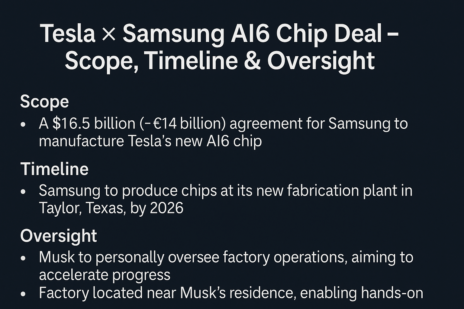 머스크가 ‘직접 감시’를 언급한 것은 생산 효율 극대화라는 목표와 맞닿아 있습니다. 그는 “삼성은 테슬라의 생산 효율 극대화를 위해 협조하겠다고 약속했다”라고 밝혔습니다. 이번 계약은 테슬라의 자율주행, 로보틱스, AI용 칩 수요 증가에 대응하기 위한 전략적 조치이며, 머스크는 이를 “전략적 의미를 갖는 딜”이라고 평가했습니다.