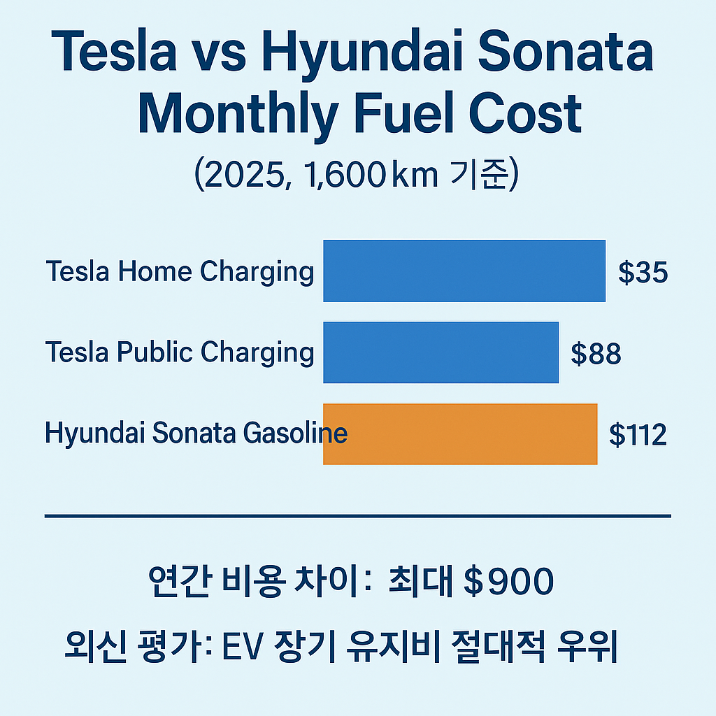 외신 보도를 종합하면, 테슬라는 “집에서 충전할 수 있느냐”에 따라 유지비 경쟁력이 극적으로 달라집니다. 가정 충전이 가능하다면 현대 쏘나타 대비 월 유지비가 절반 이하로 떨어지고, 공용 충전 위주라 하더라도 여전히 더 경제적입니다.