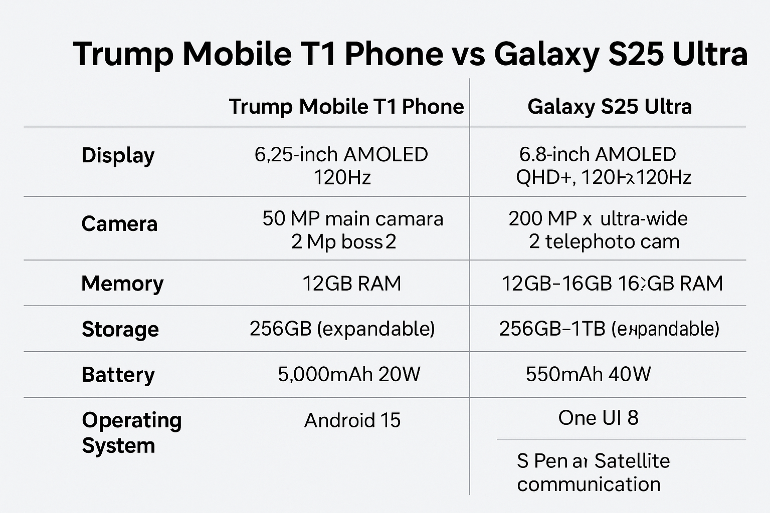 | 구분 | 트럼프 모바일 T1 폰 | 삼성 갤럭시 S25 울트라 |
