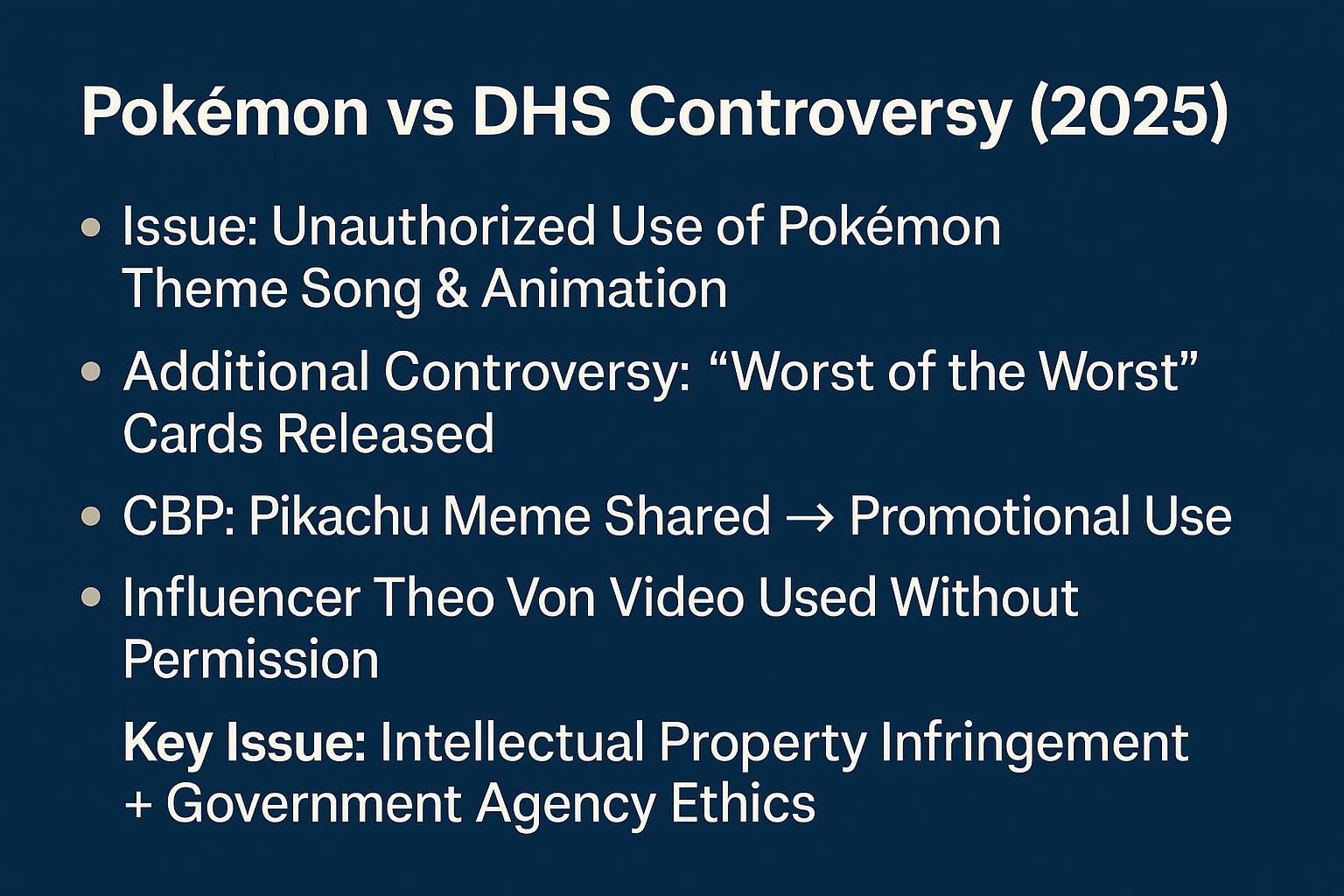 전 세계적으로 사랑받는 일본 게임·애니메이션 프랜차이즈 포켓몬이 미국 정부 기관인 국토안보부(DHS)와 예기치 못한 논란에 휘말렸습니다. 사안의 핵심은 지적재산권(IP) 무단 사용입니다. DHS가 이민 단속 홍보 영상을 만들면서 포켓몬의 대표 테마송 “Gotta Catch ’Em All”과 애니메이션 요소를 그대로 활용했기 때문입니다. 문제의 영상은 X(옛 트위터)를 통해 배포되었고, 미국 내뿐만 아니라 일본과 글로벌 팬들 사이에서도 즉각 화제가 되었습니다.