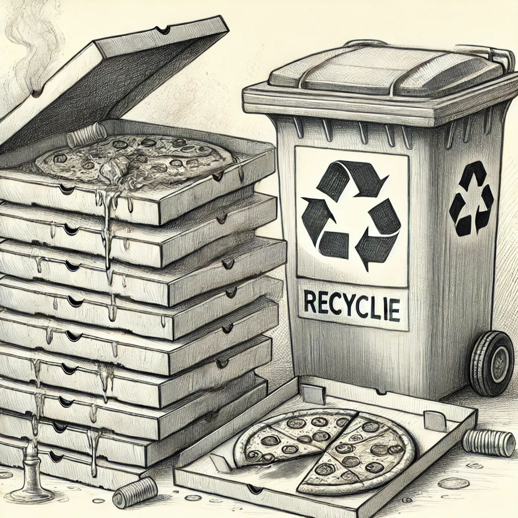 피자 상자는 주로 종이로 만들어졌지만, 기름, 치즈, 소스 등으로 오염되어 있어 재활용이 어렵습니다.
