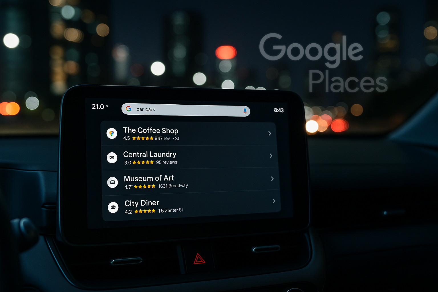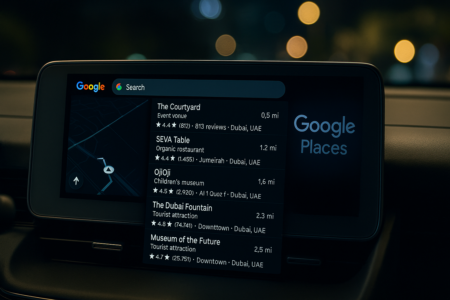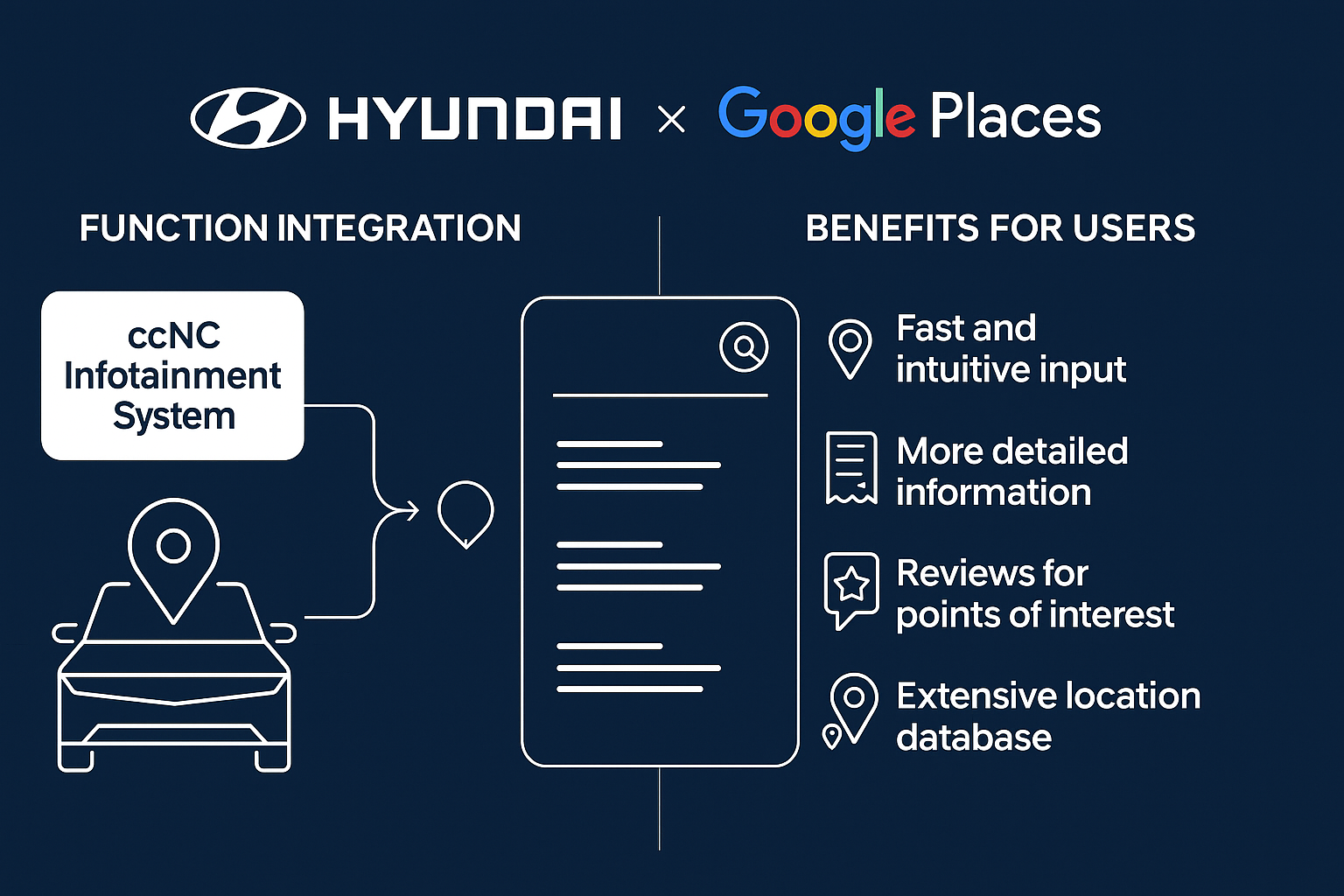 기존 차량용 내비게이션은 정형화된 주소 입력이나 한정된 관심지(POI) 정보에 의존해야 했지만, 구글 플레이스는 전 세계 2억 개 이상의 장소 데이터와 구글 사용자 리뷰, 영업시간, 사진, 태그 기반 필터, 브랜드 검색까지 포함한 방대한 위치 기반 콘텐츠를 제공합니다.