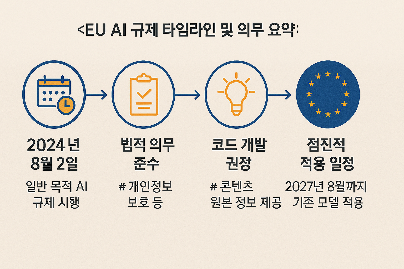 2025년 7월 11일, 유럽연합(EU)은 인공지능(AI) 기술의 발전 속도에 맞춘 새로운 규제 지침을 공개했다. 이번 발표의 핵심은 ChatGPT와 같은 일반 목적 AI(General Purpose AI, GPAI) 모델을 대상으로 하는 규제 강화다. 해당 규제는 2024년부터 단계적으로 적용 중이었으며, 오는 8월 2일부터 복잡한 AI 모델에 본격적으로 의무가 적용된다.