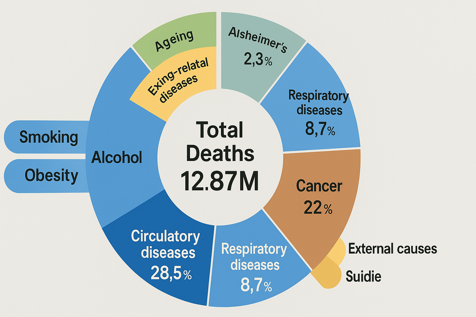 2023년 OECD 회원국에서 보고된 총 사망자 수는 약 1,287만 명입니다. 이를 원인별로 분류하면 다음과 같은 큰 축이 드러납니다.