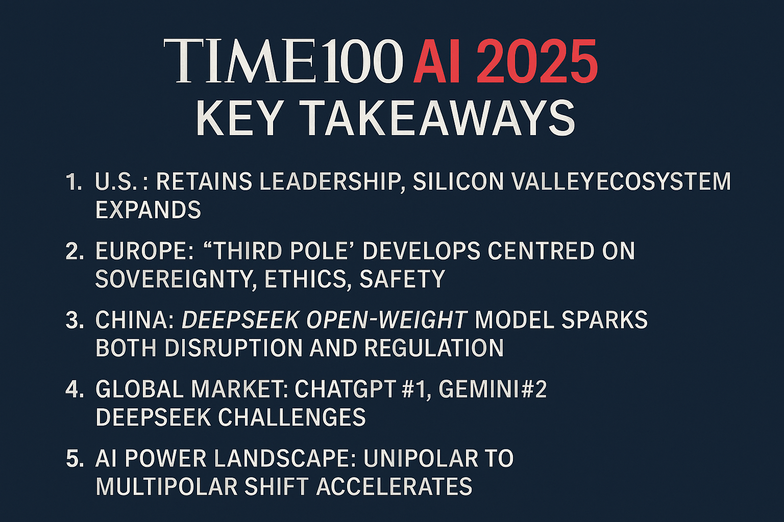 TIME100 AI 2025는 AI가 단순한 코드나 모델의 문제가 아니라, 정치·산업·문화·안보를 아우르는 글로벌 권력의 분화임을 보여줍니다.