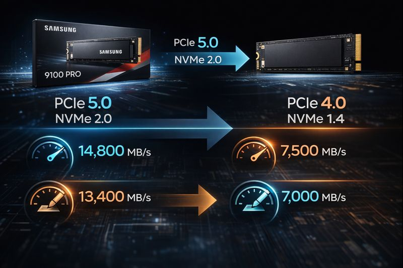 삼성 9100 프로 SSD는 최신 PCI 익스프레스 5세대 인터페이스를 사용하는 초고성능 저장장치입니다. NV미이 2.0 규격을 지원하며, 순차 읽기 속도는 최대 초당 약 만사천 메가바이트 수준에 달합니다. 이는 일반적인 소비자용 SSD와는 급이 다른 성능으로, 고성능 워크스테이션이나 데이터 처리 환경을 겨냥한 제품입니다.
