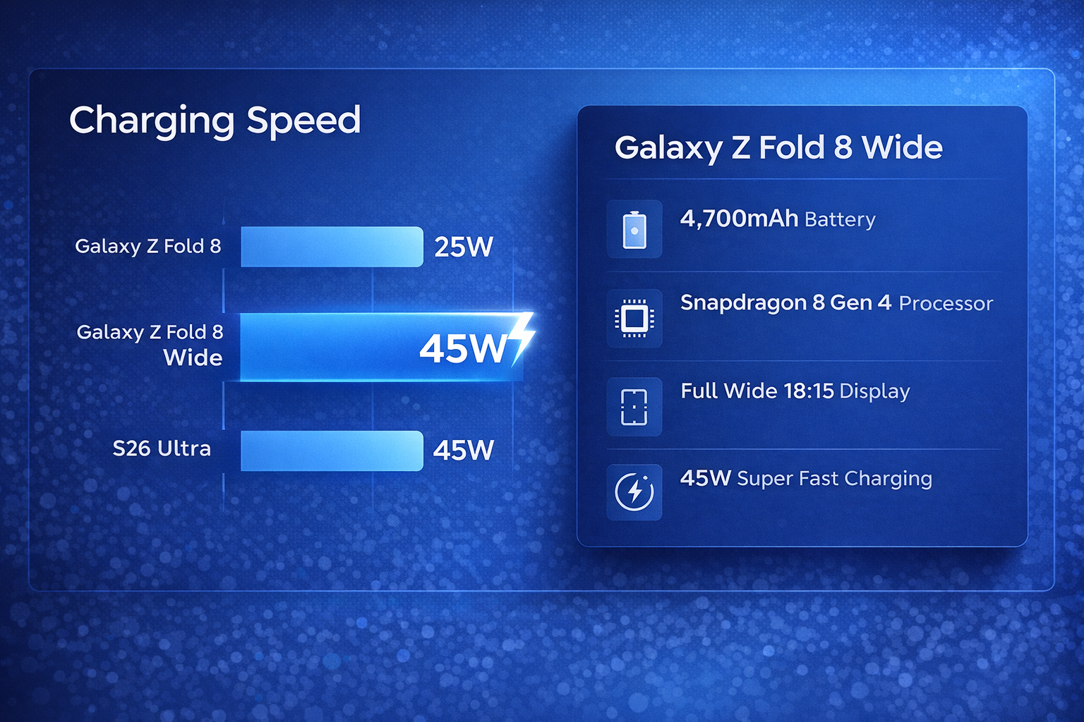삼성 Galaxy Z Fold 8 Wide의 45W 고속충전 기술 공개. 25W에서 45W로 충전 속도 80% 향상, 3:4 Wide 화면 비율, 4,900mAh 배터리 상세 분석.