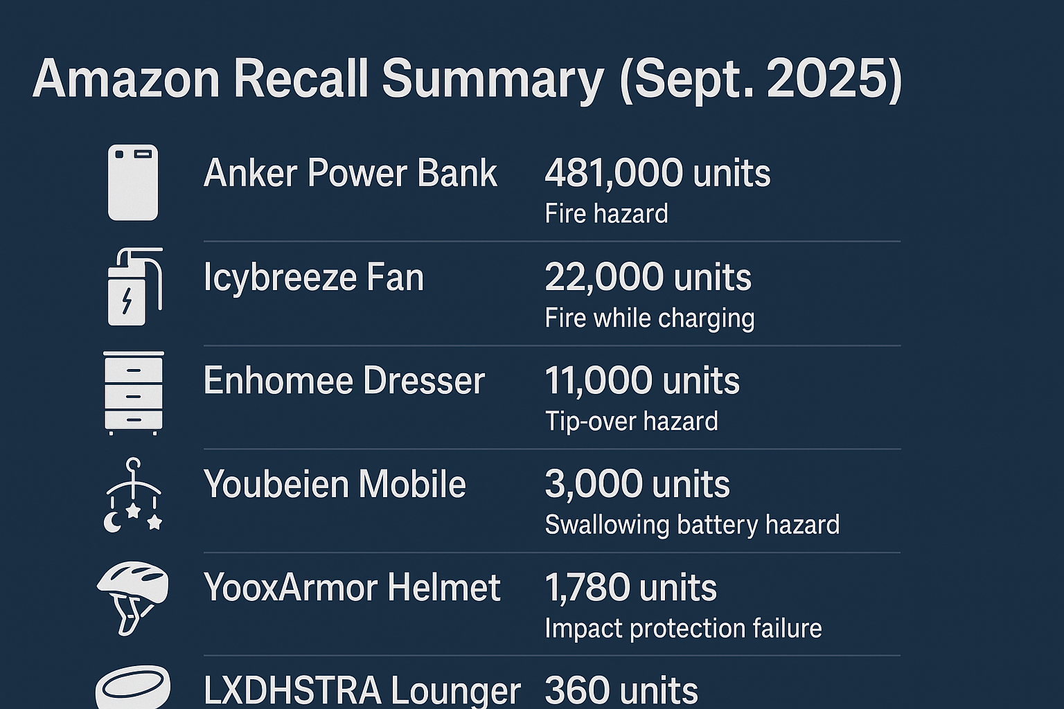 2025년 9월 23일, 미국 소비자제품안전위원회(CPSC)는 아마존을 통해 판매·유통된 50만 개 이상의 제품에 대해 리콜을 공식 발표했습니다. 리콜 대상에는 성인들이 사용하는 모바일 전자기기 액세서리부터 유아용 가구와 아기 침구까지 포함되며, 피해 가능 범위가 매우 넓습니다.